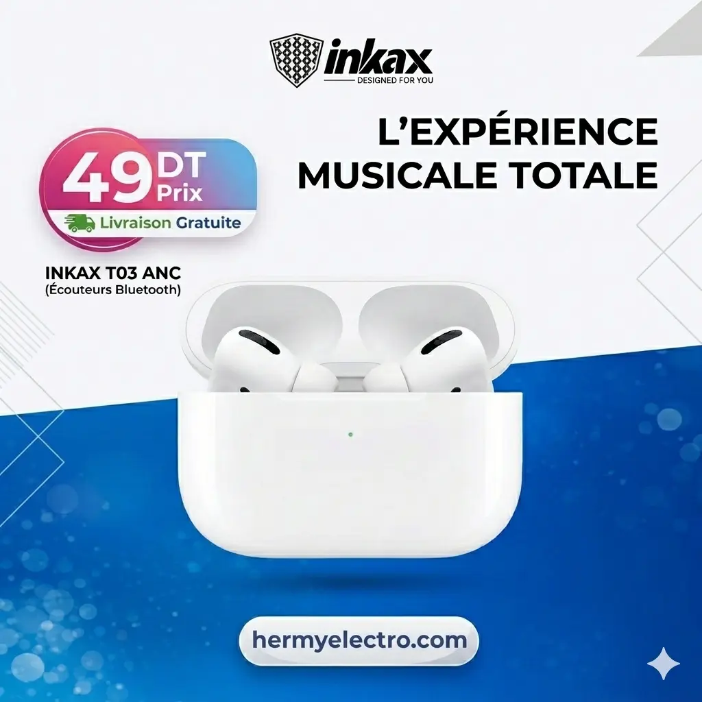 Écouteur Sans Fil INKAX T03 – Technologie de connectivité: Bluetooth 5.3 – Contrôle tactile – Capacité de batterie: 30mAh (ecouteur), 300mAh (boitier de charge) – Autonomie en veille: jusqu’à 40h – Temps de lecture / conversation: environ 4h30 – Temps de charge: environ 90 minutes – Le capteur arrête les chansons dès que le casque sort de l’oreille et fonctionne efficacement – Distance de fonctionnement: 10m – Couleur: Blanc – Garantie: 3 mois